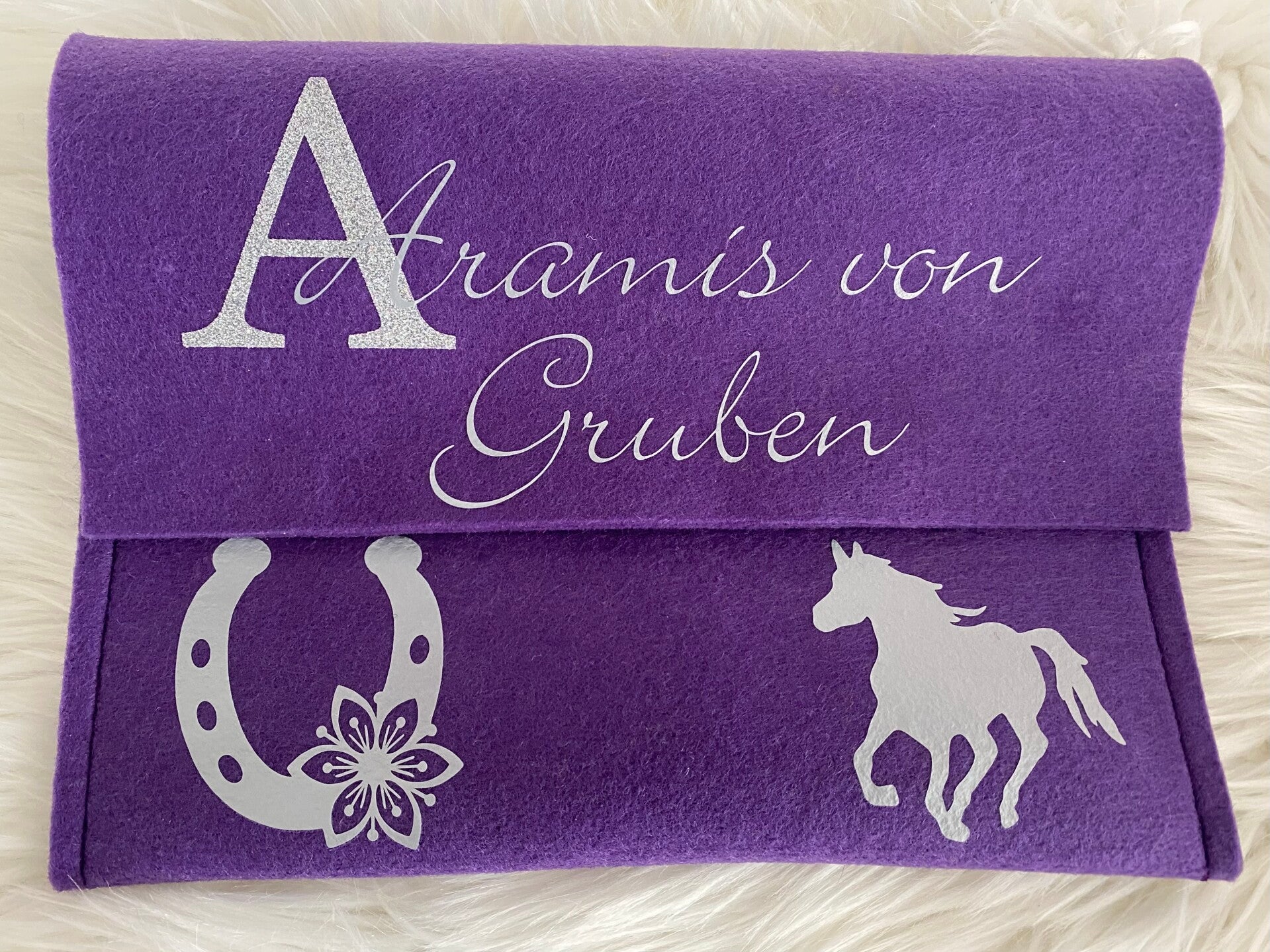 Die Equidenpasshülle schützt den Pferdepass vor Eselsohren, Leckerlispucke und fiesen Kratzern. Gut geschützt und hübsch verpackt in einer hochwertigen Filztasche.